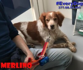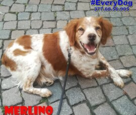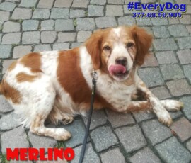 Merlino è stato accalappiato mentre vagava nelle campagne. Non sappiamo nulla della sua storia precedente. Sappiamo che era molto ammalato. E’ affetto dalla leishmania che stava provocando i primi danni visibili alla pelle. Era molto deperito.